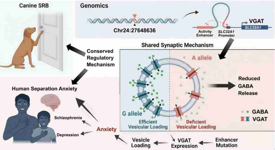 Yun Yu, Yaoyue Wu, Huairen Zhao, Zijuan Zhou, Jing Bai, Yuedong Zhang, Fengyun Zhang, Bowen Zhou, Jingyu Wang, Ya-Ping Zhang. (2026). Genetic basis of canine separation-related behavior: putative enhancer-dependent regulation of SLC32A1 and conservation in human psychiatric disorders. Journal of Genetics and Genomics.