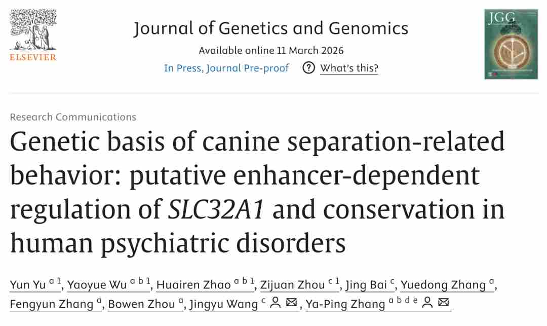 2026年3月11日,Journal of Genetics and Genomics在线发表中国科学院昆明动物研究所张亚平团队与大连医科大学王靖宇团队合作题为“Genetic basis of canine separation-related behavior: putative enhancer-dependent regulation of SLC32A1 and conservation in human psychiatric disorders”的研究论文。该论文揭示了犬类分离焦虑的遗传基础及人类相关精神疾病的保守性机制,鉴定到犬类分离焦虑和人类精神疾病的共性基因SLC32A1,为人类行为和精神疾病研究提供了宝贵模型。