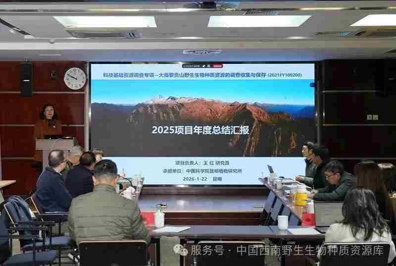 1月22日,国家科技基础资源调查专项“大高黎贡山野生生物种质资源的调查收集与保存”项目(以下简称项目)2025年度工作总结会议在昆明召开。由7位专家组成的专家组和项目各课题成员50余人参加会议。国家科技基础条件平台中心、中国科学院基础科学研究局和中国科学院昆明植物研究所相关领导出席会议。